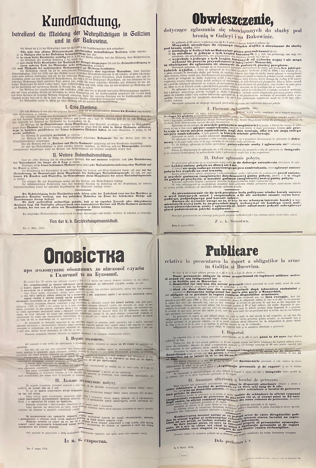 Kundmachung, betreffend die Meldung der Wehrpflichtigen in Galizien und in der Bukowina. o. O., Hof- und Staatsdruckerei/Bezirkshauptmannschaft 6. März 1916. 108 x 73 cm. Gefalt.