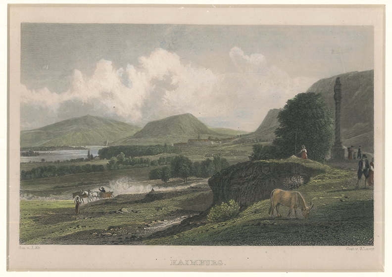 Haimburg [Hainburg].Kolorierter Stalhstich von J. v. Alt. fec. u. S. Lacey sc, Leipzig, Wiegand [1838-1840]. 12 x 17 cm. (Bildgr.). Unter Passepartout.