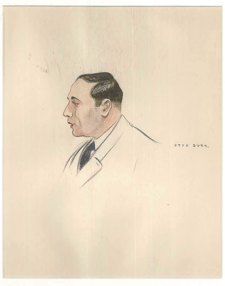 0111-26 DURA, Otto. [Mann nach links blickend]. Portrait eines nach links blickenden Mannes. Auf Schulterhöhe rechts signiert: "Otto Dura". Otto Dura ist biographisch nur lückenhaft greifbar. Vermutlich wurde er 1895 in Wien geboren und arbeitete als Maler, Graphiker und Plakatkünstler. 1922 gründete er gemeinsam mit Rudolf Samisch das "Atelier Dura-Samisch", das bis 1935 aktiv war. Dura schuf u. a. Plakate für das Kabarett Gaudeamus oder die Rolandbühne. Möglicherweise emigrierte er nach Argentinien und blieb bis 1949 in Buenos Aires, bevor er 1950 in Wien starb. | ||
