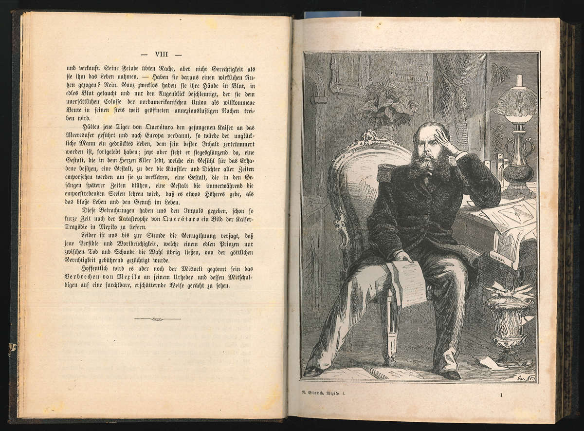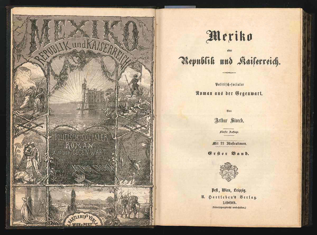 0116-23STORCH, Arthur [i. e. SCHNEEBERGER, Franz Julius]. Mexiko oder Republik und Kaiserreich. Politisch-socialer Roman aus der Gegenwart. 5. Auflage. Bde. 1 u. 2 (v. 4). in 1 geb. Pest/Wien/Leipzig, A. Hartleben's Verlag 1868. 8°. VIII, 255 (1); 255 S. Mit Frontsip. u. 11 Taf. in Holzstich. HLdr.-Bd. d. Zt. m. goldgeprägt. Rückentit. Kanten berieb. (Cyclus historisch-romantischer Schilderungen aus Oesterreichs neuester Geschichte) ÖBL 10,361ff.; vgl. Kosch 20,383 - Kolportageroman um die Geschehnisse in Mexiko. | |