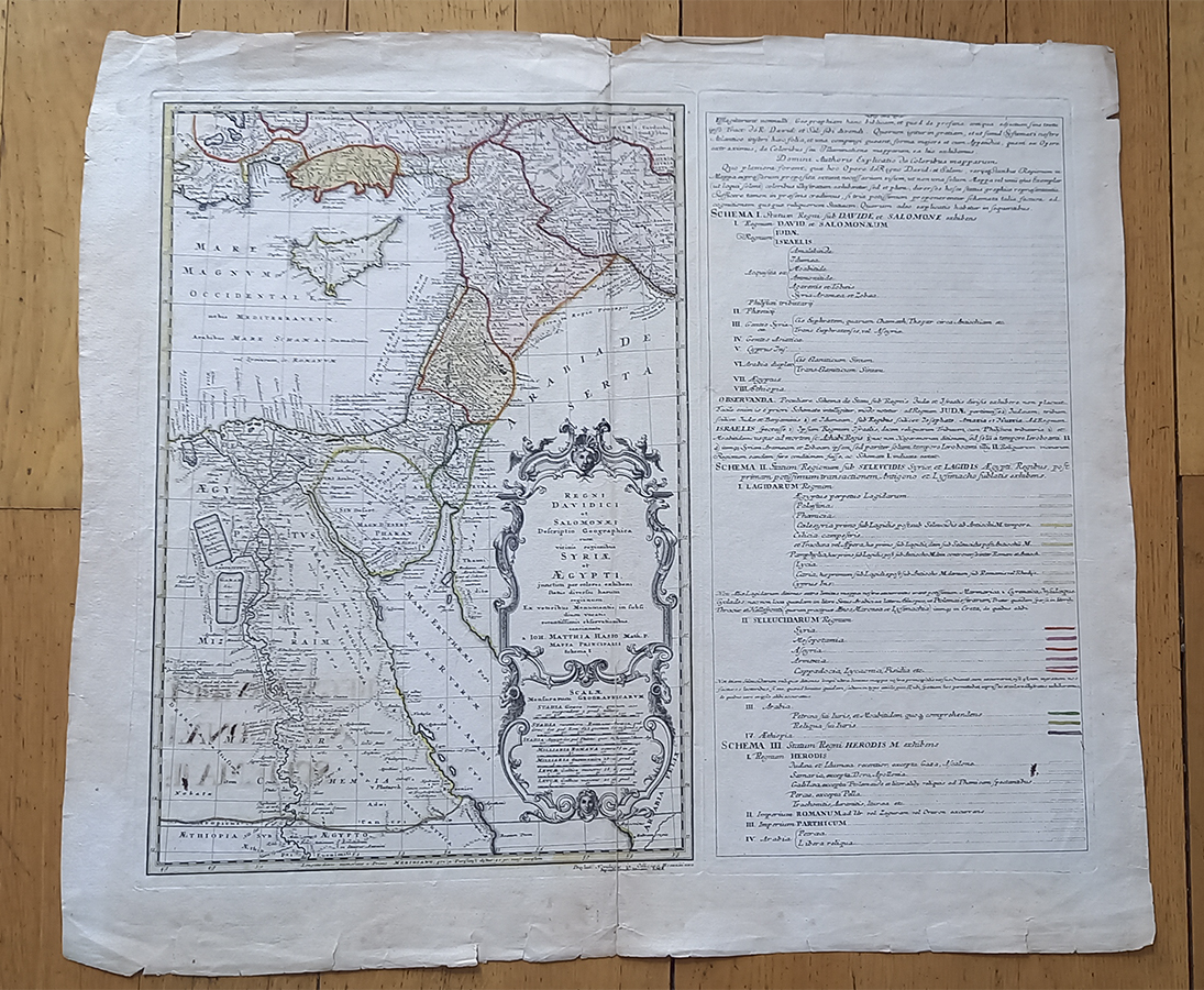 0121-18 HAASE, Johann Mattias. Regni Davidici et Salomonae descriptio Geographica cum vicinis regionibus Syriae et Aegypti. Die Karte zeigt die Südküste der Türkei westlich von Zypern, bis tief ins Landesinnere, Zypern, Syrien, Libanon, Israel, Ägypten von westlich des Nildeltas bis südlich von Elephantine bis tief ins Rote Meer. Israel wird zur Zeit Davids und Salomons gezeigt ale es seine größte Ausdehnung erreicht hatte. Rechts der farb. Karte befindet sich ein großer Textteil mit ausführlicher Legende. Johann Matthias Hase, auch Johannes Hasius, Haas, Haase (1684- 1742), war ein Mathematiker, Astronom, Kartograph und historischer Geograph. Hase gebrauchte Chronologie und Geographie zur Erläuterung der Universalhistorie in seinen Werken Regni Davidici et Salomonaei descriptio geographica et historica. - Detailed map on the Eastern Mediterranean region and extends from Turkey through Egypt. It illustrates the Kingdoms of David and Solomon. | ||||