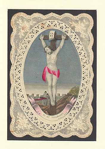 Es ist vollbracht. Altkolorierter Stahlstich (Nr. 189) auf Stanzspitze. Chrudim, Patzak [um 1850]. 12 x 8,3 cm. (Gesamtgr.). Stanzspitze etwas stockfleckig.