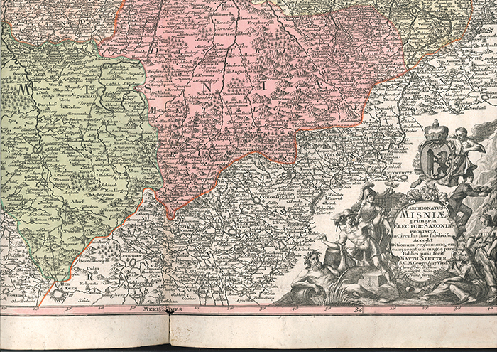 0151-18 SACHSEN - SEUTTER, Mattias. Marchionatus Misniae primaria Elector. Saxoniae Provincia, in Circulos suos subdivisus. Accedit Ditionum regionumque circumiacentium magna pars; Publici juris fecit Matth. Seutter S. C. M. Geogr. Aug. Vind. Matthäus Seutter; 1678-1757; war ein deutscher Kartograf und Kupferstecher sowie Gründer der Druckerei und des Verlages Seutter. Wie vor ihm bereits Homann, erhielt auch Seutter 1731/32 von Kaiser Karl VI. den schönen, aber bedeutungslosen Titel Sacrae Caesareae Maiestatis Geographus, das heißt kaiserlicher Geograph (auf den Karten abgekürzt S.C.Maj. Geogr oder SCMG). Außerdem wurde ihm 1741 ein kaiserliches Druckprivileg verliehen, das jedoch nur für den schwäbischen und oberrheinischen Reichskreis sowie für den Bereich fränkischen Rechts galt. Nach Seutters Tod im Jahr 1757 führte sein Sohn Albrecht Carl (1722-1762) die Firma alleine weiter. Er überlebte seinen Vater aber nur um 5 Jahre. Seine Witwe verkaufte den Verlag daraufhin jeweils etwa zur Hälfte an Matthäus Seutters Schwiegersohn Tobias Conrad Lotter und den ebenfalls nahe verwandten Kunstverleger Johann Michael Probst (1727-1776). Sie ersetzten auf dem Großteil des 1762 erworbenen Kartenbestandes Seutters Namen durch den eigenen. | |||