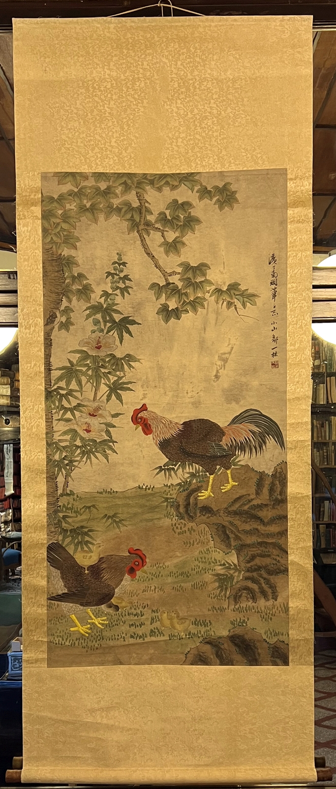 0154-26Two Chicken and Chicks.Chinese Hanging Scroll. Heigth 78.3". Width 30.3". (199 x 77 cm.). Wooden roller ends. Hand coloured paper on silk layer. Chickens have symbolic value in Chinese culture and often serve as protectors against evil.