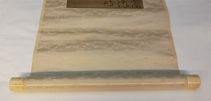 Calligraphy. (Ink on Silk). Antique hanging silk scroll. Japan. Heigth 48.0". Width 12.1" (ca. 121,9 x 30,7 cm). Bone roller ends. Rubbed.