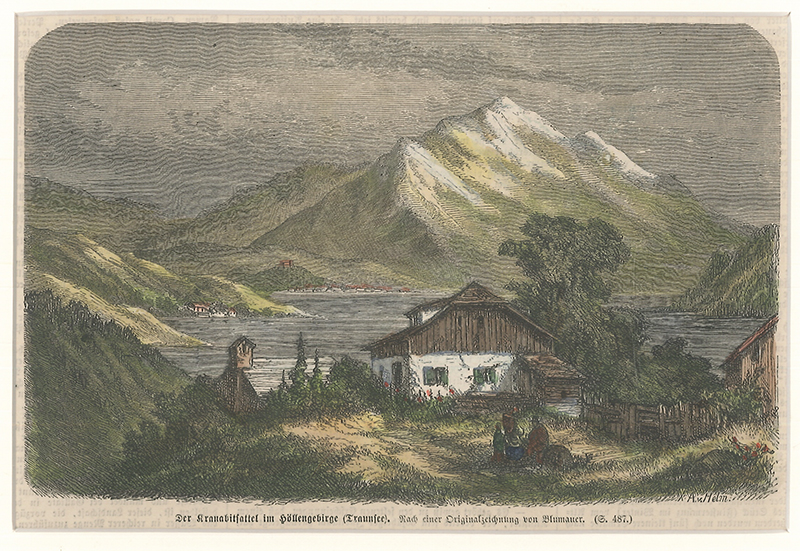 0165-26TRAUNSEE - BLUM;AUER, Carl - HELM, Edmund. Der Kranabitsattel im Höllengebirge Traunsee.kolorierte Xylographie - Holzschn. Stuttgart, Allgemeine Illustrirte Zeitung [ca. 1870]. 12 x 18, 3 cm. (Bildgr.). Unter Passepartout.