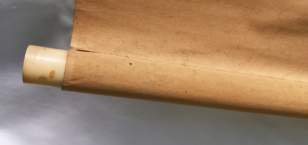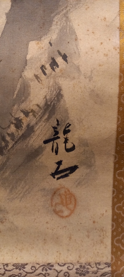 0192-26Tiger. Antique hanging paper scroll. Bordered with silk and silk brocade. Japan. Heigth 73,6". Width 20,5" (ca. 187 x 52,2 cm). Bone roller ends. Very good condition. Japanese paper hanging scroll bordered with silk and silk brocade, showing a Tiger in a landscape. With unknown seal. | |