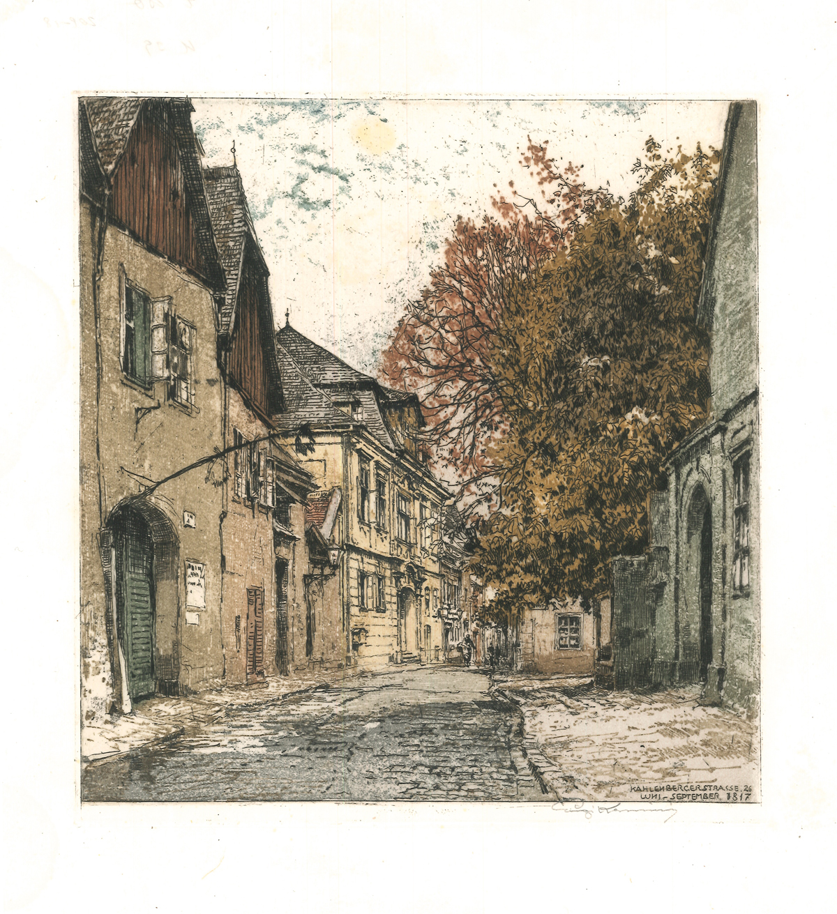 0209-18 BEETHOVEN - KASIMIR, Luigi. Graphiker (1881-1962). Kahlenbergerstrasse. vgl. Thieme-B. XIX, 582f.; Schüttler, Wien 1944; Halm & Goldmann Nr. 1 - Vom Künstler eigenhänd. signiert. In der Platte bezeichnet. "Kahlenbergerstrasse 26 Juni-Sepatember 1817. Das Blatt zeigt das Haus in dem Beethovens Wohnung lag, der im Sommer 1817 in Nußdorf im Haus des Bürgermeisters Greiner wohnte. | ||