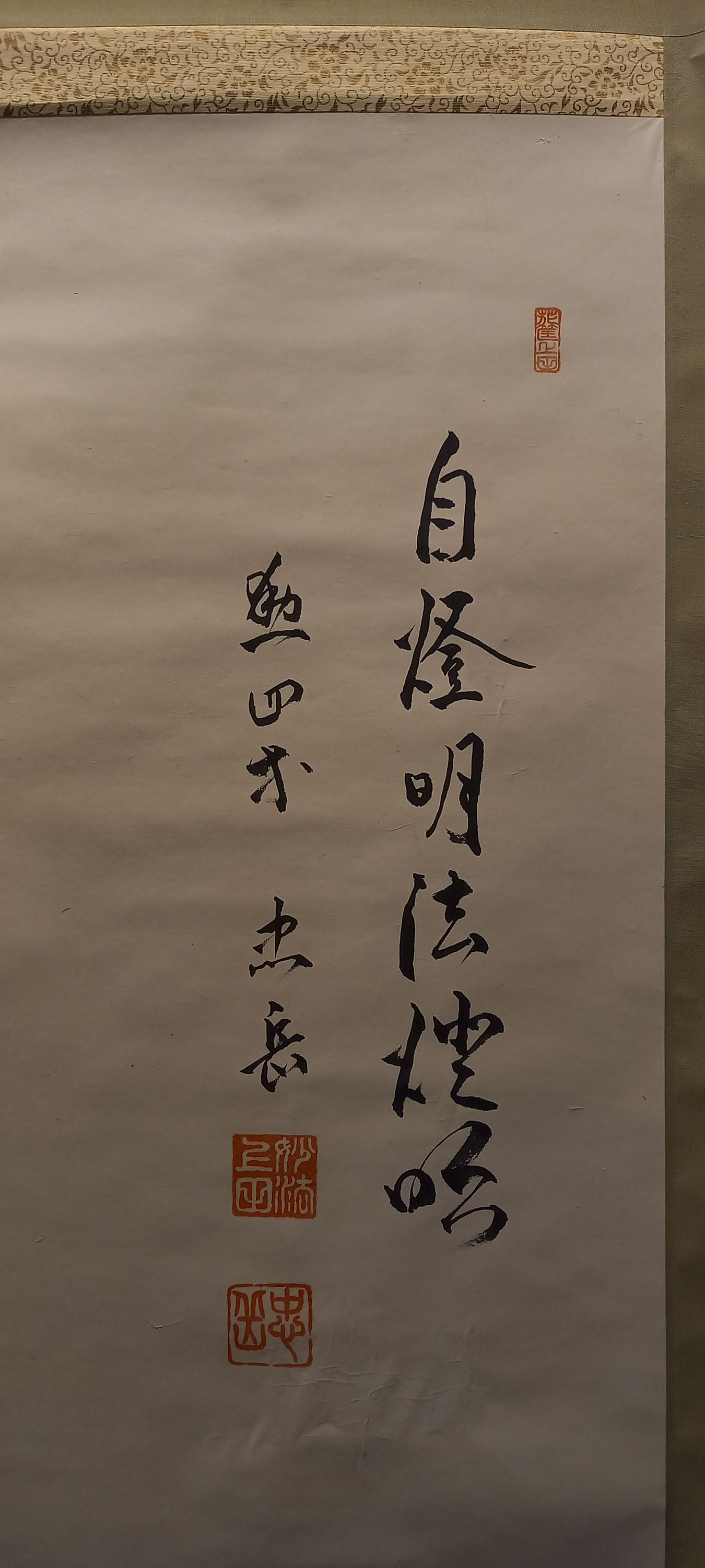 0228-26Bodhidharma. Antique hanging paper scroll. Bordered with a silk and silk brocade. Japan, after 1940. Heigth 74, 8". Width 19.6" (ca. 190 x 50 cm.). Resin roller ends. Good condition. Japanese paper hanging scroll depicting Bodhidharma (5./6.century), whose life is the topic of various legends. | |