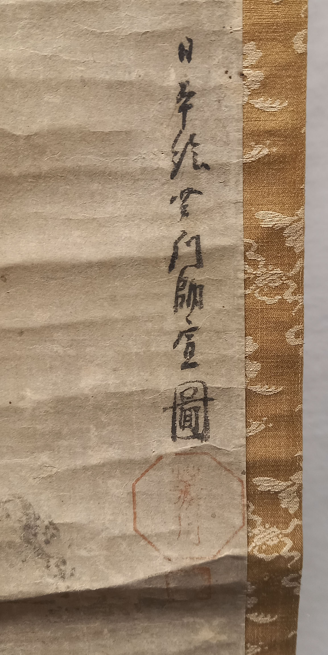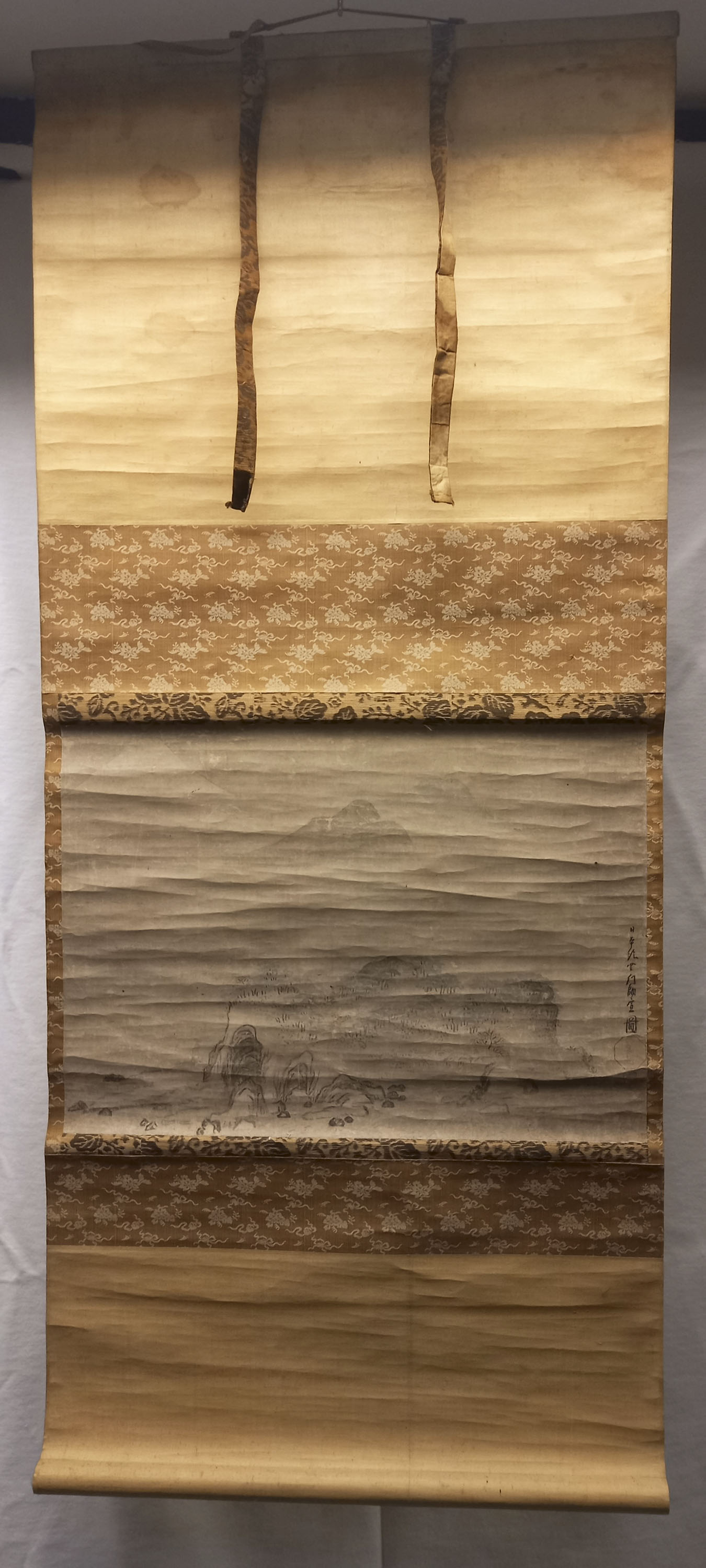 0229-26Foggy mountain landscape. Antique hanging paper scroll. Bordered with a silk and silk brocade. Japan. Heigth 47, 2". Width 20, 6" (ca. 120 x 52, 5 cm.). Roller ends missing. Rubbed, folding lines visible, some stains in the upper part. Japanese paper hanging scroll with a fogggy mountain landscape. | |