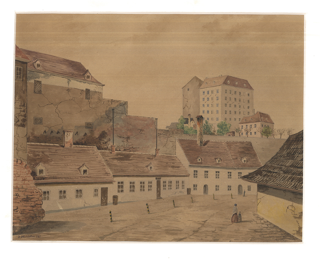 0241-25 HAHÖCKER, J[ohann]. Im untern Arsenal. Original-Aquarell mit einer Ansicht eines Teils der Schottenbastei. "Aus dem unteren Arsenal. Das Zeughaus Hofparthie, mit Blick auf das Kegelhaus [früher Kögelhaus] auf der Schottenbastei im Jahre 1856 (Catalog Karajan No. 428). Nach einem in der Städtischen Bibliothek befindlichen Aquarell von F. Seybold a. J. 1856 copirt von Joh. Hahöcker [1833-1904] 1889". Das egentliche untere Arsenal befand sich im in der Seilerstätte 22 (Siehe Czeike V, 702). | ||