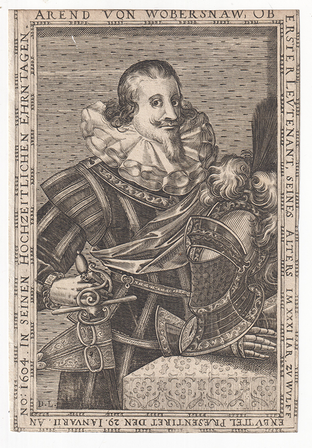 0276-25 WOPERSNOW - [LINDMEIER, Daniel]. Arend von Wobersnaw, ob erster Leutenant, seiners Alters im XXXI Jar zu Wulffenbüttel praesentiret den 29. Januari Anno 1604 in seinen Hochzeitlichen Ehrntagen. Portrait des Leutnants und Beamten Arndt von Wopersnow (1573-1621) von Daniel Lindmeier (nachgew. 1600-1637). | ||