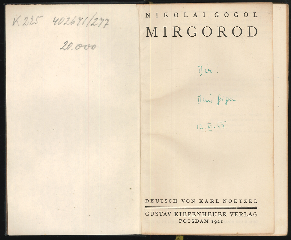 0303-26GOGOL, Nikolai. Mirgorod. Deutsch von Karl Noetzel.6.-10. Tsd. Potsdam, Kiepenheuer 1924. kl.-8°. 268 S., 2 Bll. OLdr. Mit Rückengoldpräg. u. Kopfgoldschn. Berieb. Widm. am Tit.