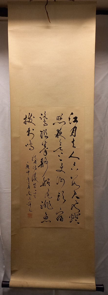 0315-26Calligraphy Antique hanging paper scroll. Bordered with silk brocade. Japan. Heigth 61,4". Width 22,8" (ca. 156 x 48 cm). Wooden roller ends. Good condition Japanese paper hanging scroll (Kakejiku) with Calligraphy and unknown signature seal. | |