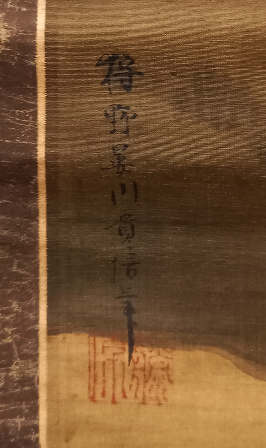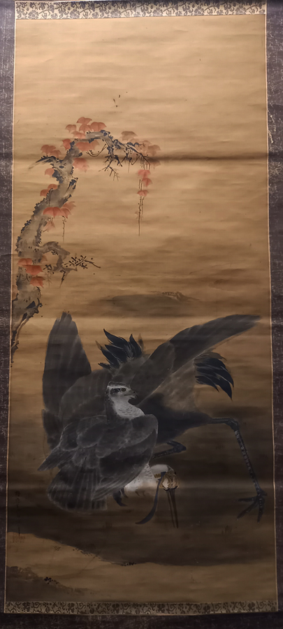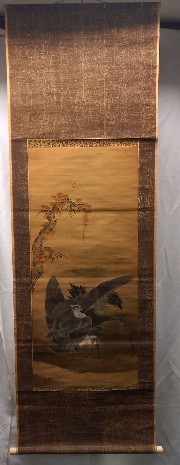 0319-26Buzzard and Crane. Antique hanging silk scroll. Bordered with silk brocade and coloured paper. Japan/China? Heigth 65,7". Width 21,4" (ca. 167 x 54,5 cm). Bone roller ends. Rubbed, some small worm holes. Paper with visible folding lines. Silk hanging scroll (Kakejiku) depicting a fighting buzzard and crane. With an unknown signature seal. | |