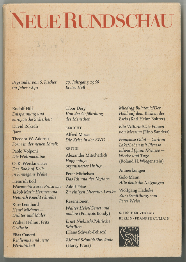 Enthält unter anderem Beiträge von: Rud. Hilf, Th. W. Adorno (Form in der neuen Musik), H. Böll, E. Canetti (Realismus und neue Wirklichkeit), A. Mitscherlich, Fr. Gilot, Golo Mann (Alte deutsche Neigungen) u. a.
