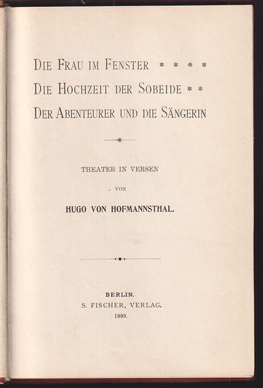 Theater in Versen. Die Frau im Fenster. Die Hochzeit der Sobeide. Der Abenteurer und die Sängerin. Theater in Versen.Berlin., S. Fischer 1899. 8°. 260 S. Ln.-Bd. d. Zt. Mit toldgprägt. Rückensch. EA.