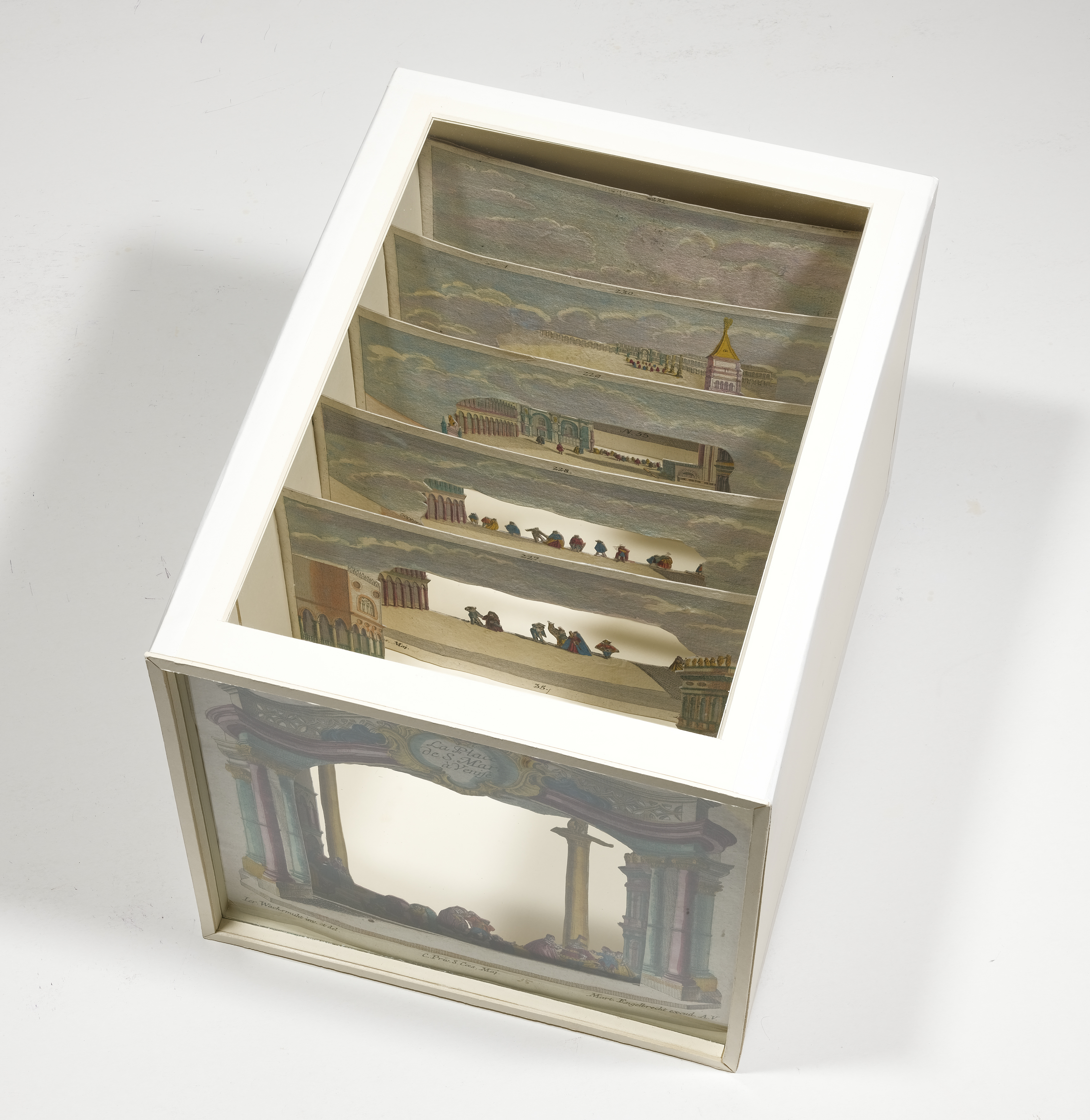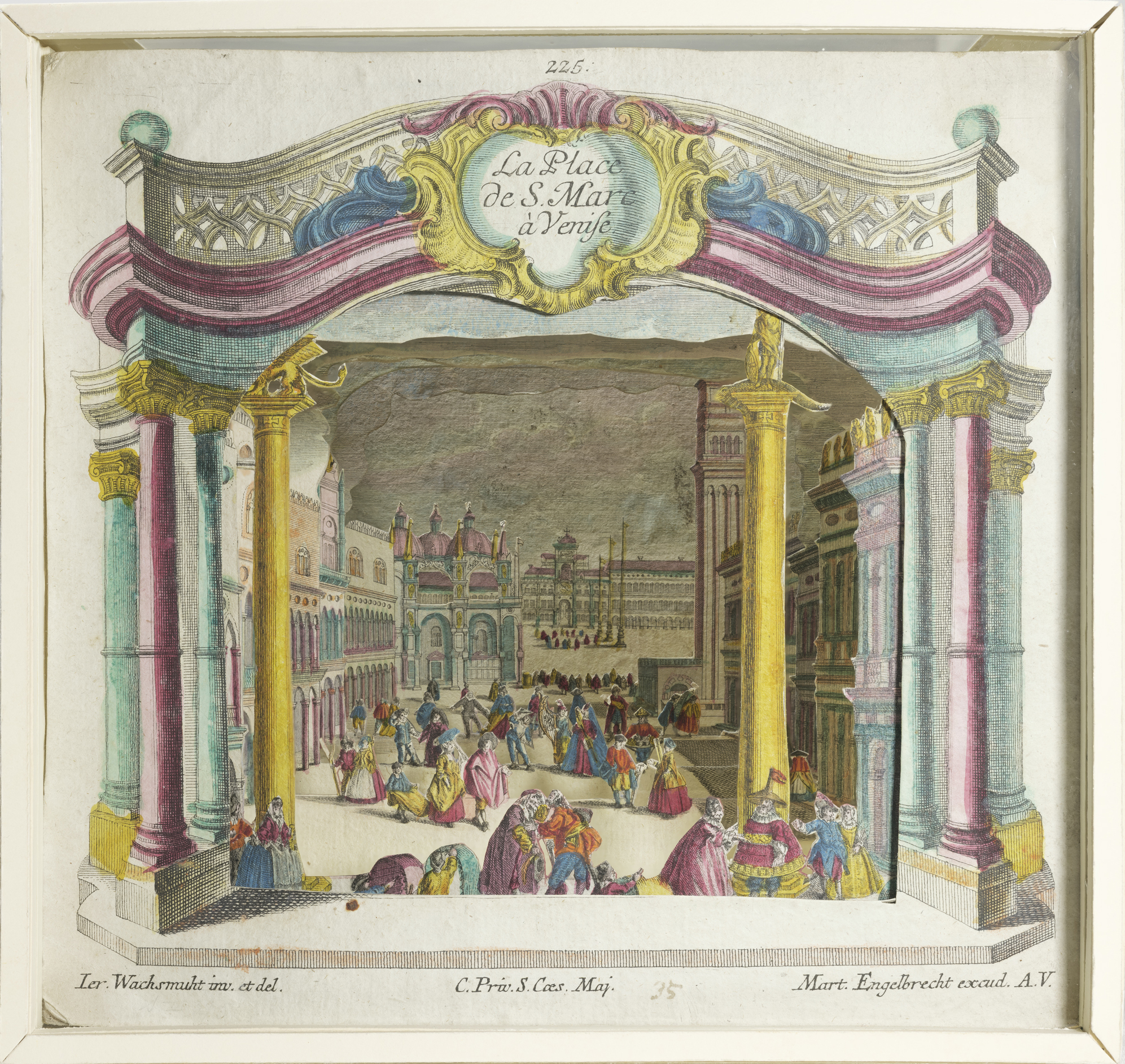0619-25 WACHSMUTH, Jer[emias] - ENGELBRECHT, Mart[in]. La Place de S. Marc à Venise. Diorama Milano/Seitz 35, 225 - 231; vgl. Ralph Hyde, Paper Peepshows, 2015, S. 14 - Komplettes Diorama/Perspektivtheater mit dem Proszenium "La Place de S. Marc à Venise" nach Entwürfen von Jeremias Wachsmuth (1712-1779) und in Ausführung von Martin Engebrecht (1684-1756), der für seine Ausschneidebögen, Kupferstiche und Dioramen bekannt ist. Das Diorama zeigt den Markusplatz in Venedig in 7 perspektivisch ausgeschnittenen Radierungen, inklusive Proszenium, das eingebettet in barocke Architektur, den Titel "La Place de S. Marc à Venise" trägt. Die Radierungen sind jew. numeriert von 225-231 und in der Platte signiert. "Ier. Wachsmuth inv. et del. C. Priv. S. Caes. Maj. Mart. Engelbrecht excud. A.V.". Die auf Karton aufkaschierten Tafeln sind in einem Abstand von 5 cm in seitliche Führungsschlitze eingesetzt und von vorne und oben gut beleuchtet, sodass die perspektivische Tiefenwirkung und das lebendige Kolorit eindrucksvoll zur Geltung kommen. | |||