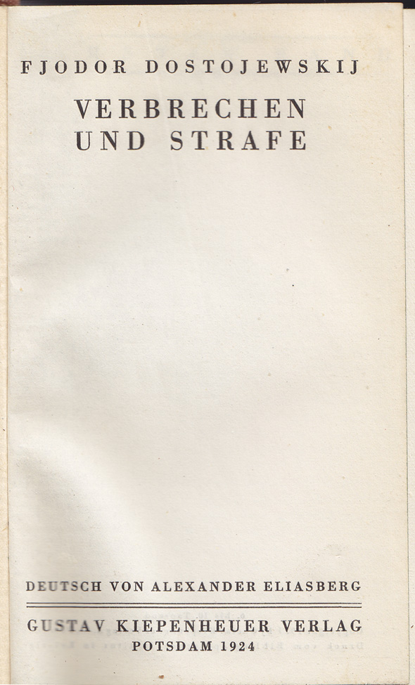 Verbrechen und Strafe. Deutsch v. Alexander Eliasberg.6.-10. Tsd. Potsdam, Kiepenheuer 1924. kl.-8°. 708 S. OLn. Kanten berieb.