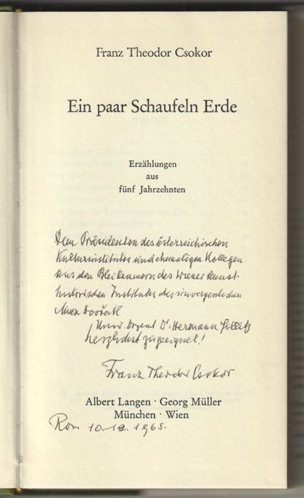 0888-23CSOKOR, Franz Theodor. Ein paar Schaufeln Erde. Erzählungen aus fünf Jahrzehnten.Mchn./Wien, Albert Langen - Georg Müller (1965). 8°. 202 S. OLn. m. OU., dieser m. kl. Einriss. EAW.-G² 49 - Mit mehrzeiliger eigenhändiger Widmung des Verf., datiert 1965.