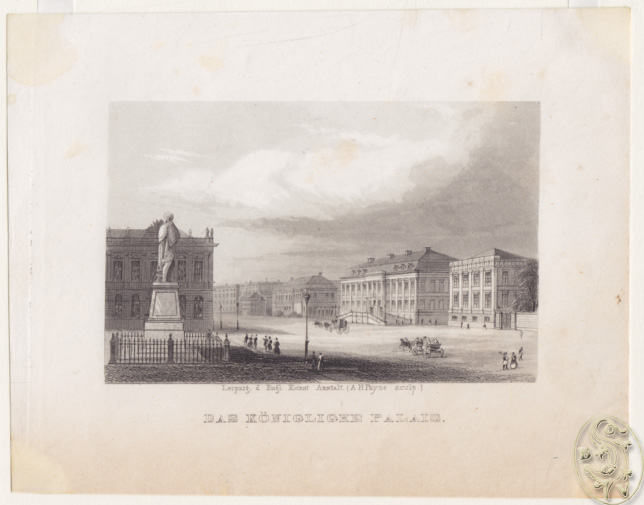 Das königliche Palais.Orig.-Stahlstich v. A. H. Payne Lpz., Engl. Kunst Anstalt [ca. 1840]. 7 x 11 cm. (Bildausschn.). Unter Passep. Leicht braunfleckig.