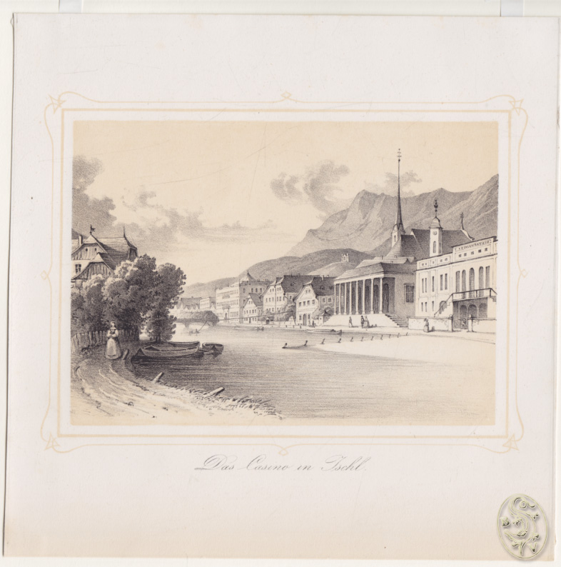Das Casino in Ischl.Orig.-Tonlithographie aus Ludwig "Die neuesten Erinnerungen an Ischl und seine Umgebung". [Salzburg, Baldi & Würthle ca. 1840]. 11 x 15 cm. (Bildausschn.). Unter Passep.