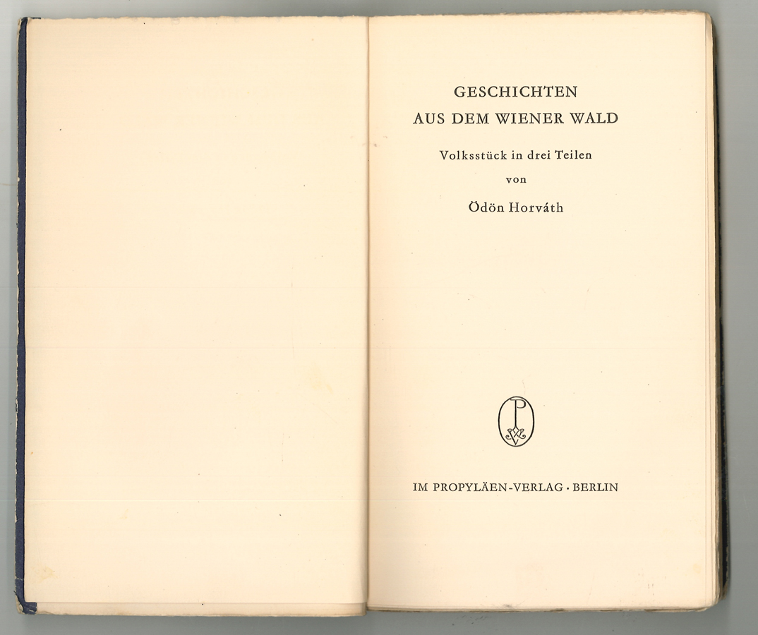 1024-25 HORVÁTH, Ödön v. Geschichten aus dem Wiener Wald. Ein Volksstück in drei Teilen. W.-G.² 4 - Sehr seltene Erstausgabe von Ödön von Horváths (1901-1938) Theaterstück. Bei dem vorliegenden Exemplar handelt es sich um eines im originalen, farbig illustrierten Broschureinband. Von der Erstausgabe wurde wohl eine Auflage von 1500 Stück gedruckt, einige Exemplare wurden in Halbleinen gebunden, sodass vermutlich weniger als 1000 Stück in der Broschur in den Handel gelangten. Die letzten beiden Blätter "Beachten Sie die folgenden Seiten" mit Verlagsanzeigen für Horváths "Der ewige Spiesser" und "Italienische Nacht". | |||