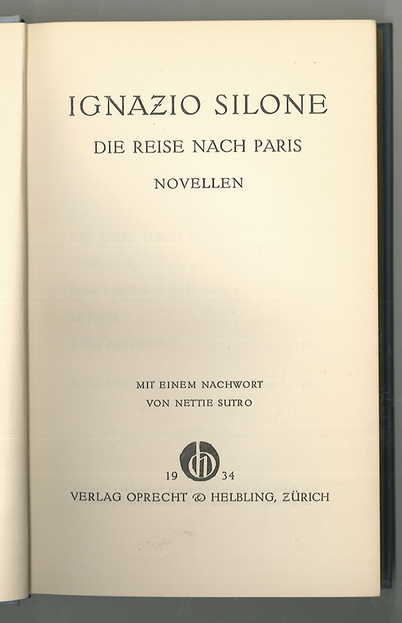 1115-25SILONE, Ignazio. Die Reise nach Paris. Novellen. Zürich, Oprecht & Helbling 1934. 8°. 2 Bll., 223 S. mit 6 Holzschnitt-Abbildungen von Clément Moreau. OLn.-Bd. mit geprägtem Deckel- u. Rückentitel. Rücken leicht ausgeblichen, innen etwas gebräunt. EA. Leinenausgabe der deutschen Erstausgabe von Ignazio Silones (1900-1978) Werk. Die Übersetzung und das Nachwort stammen von Nettie SUTRO. | |