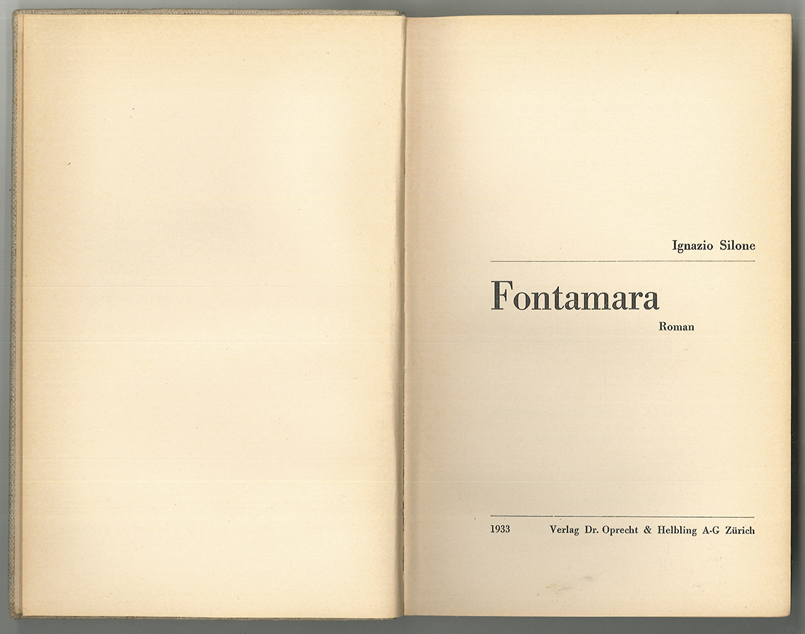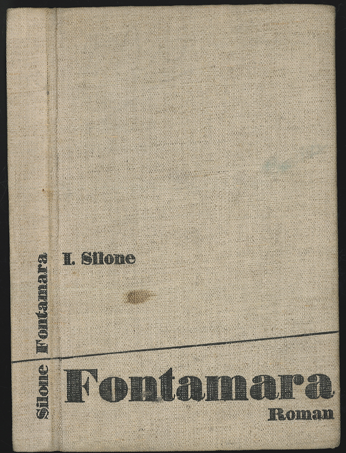 Fontamara. Roman. Zürich, Oprecht & Helbling 1933. 8°. 2 Bll., 210 S., 3 Bll. OLn.-Bd. mit geprägtem Deckel- u. Rückentitel. Einband etwas fleckig. Innen leicht gebräunt. EA.