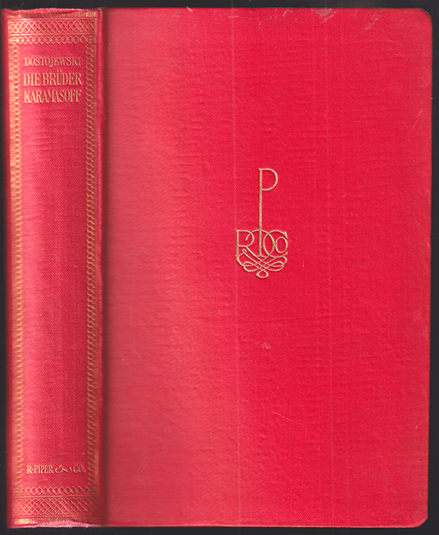 Die Brüder Karamasoff. Roman.München, Piper 1923. 8°. XX, 1464 S., 1 Bll. auf Dünndruckpapier. OLn. Mit Goldpräg. u. hs Besitzvermerk auf dem fliegenden Vorsatz.