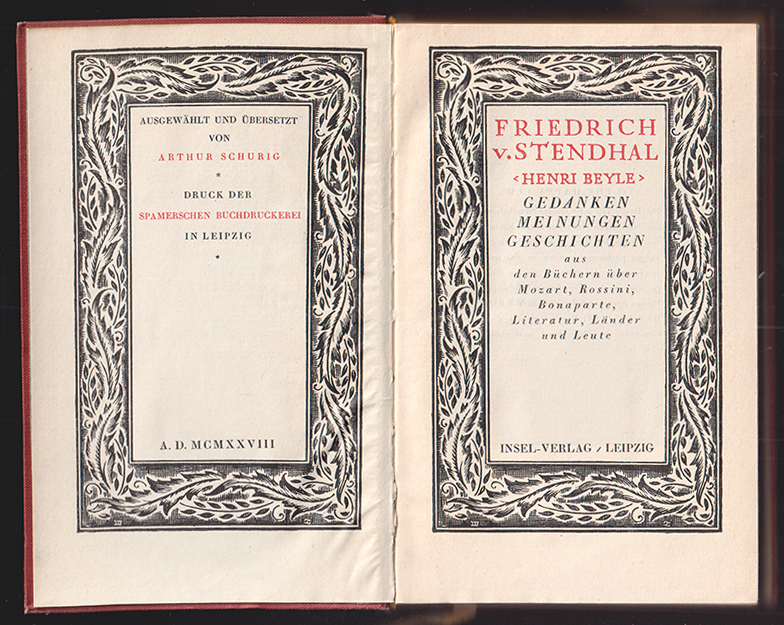Gedanken, Meinungen, Geschichten aus den Büchern über Mozart, Rossini, Bonaparte, Literatur, Länder und Leute. Ausgewählt und übersetzt von Arthur Schurig. Leipzig, Insel 1928. 8°. 703 (3) S. auf Dünndruckpapier. OLn. m. Goldpräg. Besitzverm. a. d. Innendeckel. In gutem Zustand.