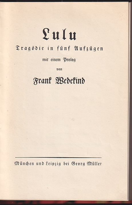 Lulu. Tragödie in fünf Aufzügen. Mit einem Prolog.München/Leipzig, Georg Müller [1913]. 8°. 220 S., 2 Bll. HLn.-Bd. d. Zt. Mit farb. Modelldruckpapier. EA.