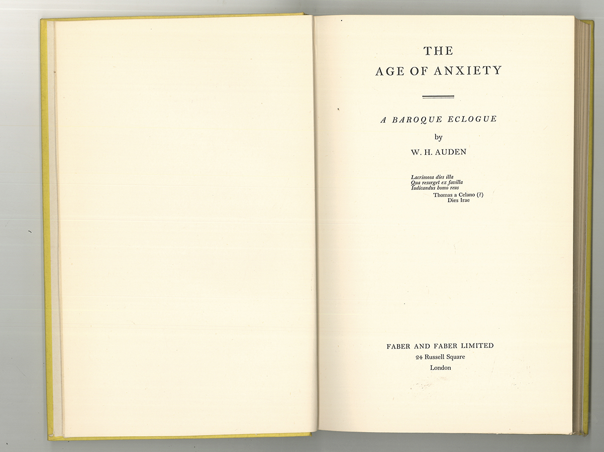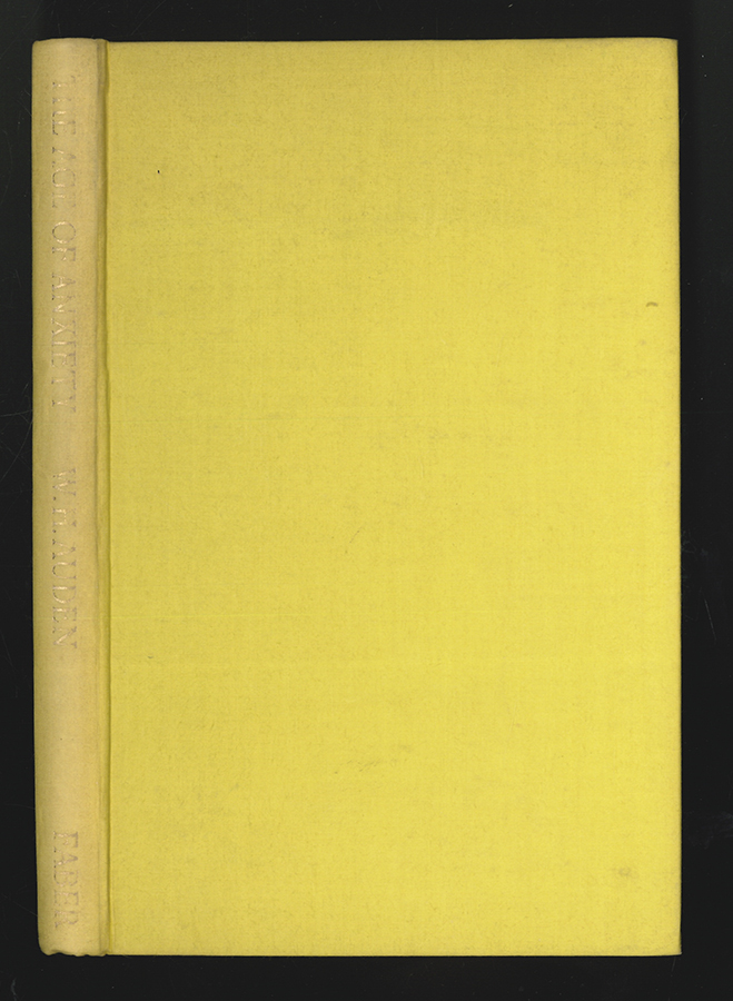 The Age of Anciety. A baroque eclogue. (Second impression). London, Faber and Faber (1949). 8°. 3 Bll., 126 S. Gelber OLn.-Bd. mit goldgeprägtem Rückentitel. Rücken etwas berieben. Innen sehr gut erhalten.