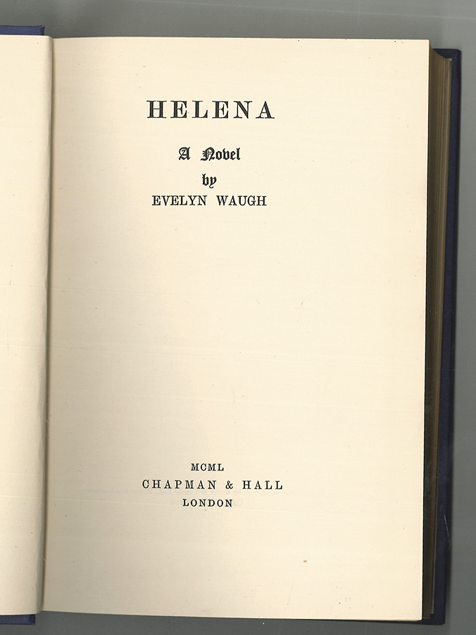 1292-25WAUGH, Evelyn. Helena. A Novel.London, Chapman & Hall 1950. 8°. 2 Bll., XIII, 265 S. Blauer OLn.-Bd. mit goldgeprägtem Rückentitel. Einband etwas fleckig, innen minimal angegilbt. Erstausgabe des Romans von Evelyn Waugh (1903-1966).