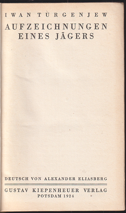 Aufzeichnungen eines Jägers. Deutsch v. Alexander Eliasberg.2 Bde. in 1 geb. Potsdam, Gustav Kiepenheuer 1924. kl.-8°. 232 (1), 230 S., 1Bl. Flex. OLdr.-Bd. Goldpräg., Kopfgoldschn., Rückenkanten beschäd.