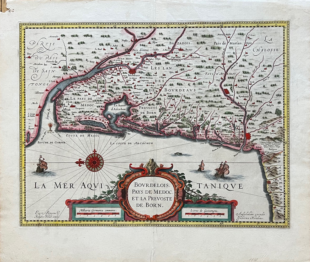 1303-17 Bourdelois, Pays de Medoc, et la prevoste de Born. Mit dekorativer Titel- u. Meilenzeigerkartusche, Seerose, Schiffen und Meeresungeheuer geschmückt. Außerdem mit Wäldern, Bergen, Städten und einem Leuchtturm. Deutscher Text auf der Kartenrückseite. Zeigt das Gebiet zwischen der Mündung Garonne ins Mittelmmer und Bayonne sowie Mont-de-Marsan und Montendre. | |||