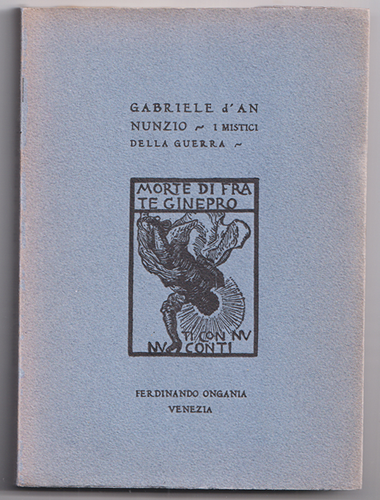 1318-25D'ANNUNZIO, Gabriele. I mistici della guerra. Morte di frate Ginepro.Venezia. Ongania (1948). 8°. 90 S.. 4 Bll. Mit ill. Tit. u. farb. Initialen. OKart. Unaufgeschnitten. Nr. 496 von 1700 num. Exemplaren. Druck in Rot u. Schwarz..