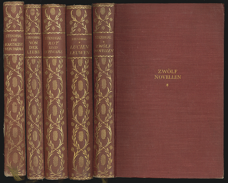 1322-25 STENDHAL, Friedrich v. (Henry Beyle). [Gesammelte Werke]. Übertragen von Otto Freiherrn von Taube und Arthur Schurig. Sarkowski 1638 - Bd. 1: Das Leben eines Sonderlings; Bd. 2: Von de Liebe; Bd. 3: Armance (fehlt); Bd. 4: Rot und Schwarz; Bd. 5: Lucien Leuwen; Bd. 6: Die Kartause von Parma; Bd. 7: Zwölf Novellen; Bd. 8: Gedanken, Meinungen, Geschichten… | |||