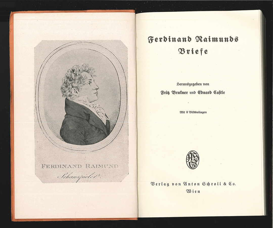 1325-22RAIMUND, Ferdinand. Briefe. Herausg. v. Fritz Brukner u. Eduard Castle. Wien, Anton Schroll & Co. 1926. kl.-8°. LXVII (1), 645 (1) S. mit Portraitfrontisp. u. 7 Taf. Bedruckter OKart mit Rücken- u. Deckelschildchen. An den Kapitalen leicht eingerissen, mit leichten Randläsuren.Innen gut erhalten. EA Briefe von Ferdinand Raimund (1790-1836) u. a. an Antonie "Toni" Wagner (1799-1879), aber auch Geschäftsbriefe bzw. Reisebriefe. | |