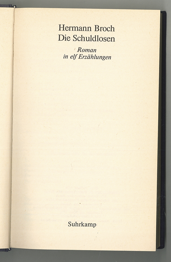 1325-25BROCH, Hermann. Die Schuldlosen. Roman in elf Erzählungen.Frankfurt/Main, Suhrkamp 1976. 8°. 352 S. Blauer OLn.-Bd. mit Rückentitel. Gut erhalten: Erschien als Band 5 der kommentierten Werkausgabe, herausgegeben von Paul Michael Lützeler.