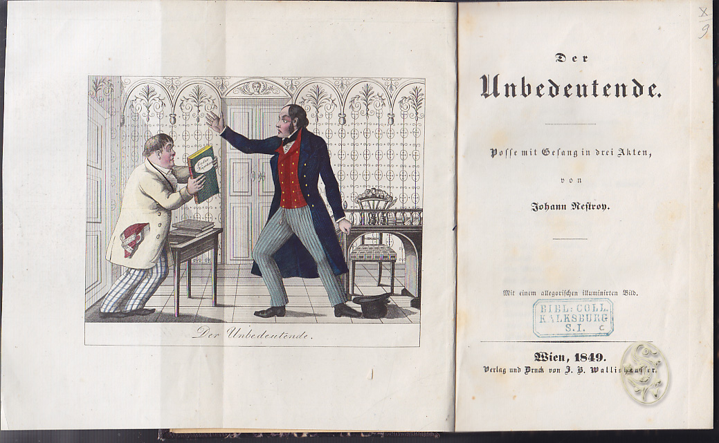 1326-13 NESTROY, Johann. Der Unbedeutende. Posse mit Gesang in drei Akten. W.-G.² 12; Wurzbach XX, 210; Rabenlechner I, 61; Slg. Mayer 6306 - Der kolor. Kupferstich zeigt den Schauspieler Nestroy als "Zimmermann Peter Span" und Wenzel Scholzin in der Rolle des "Sekretär Puffmann". | ||||