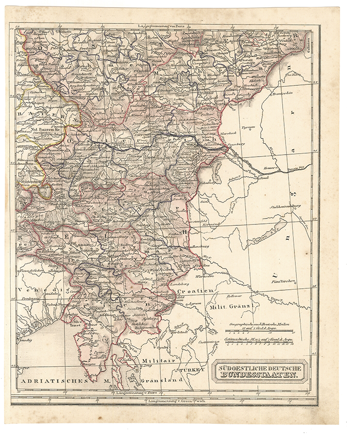 Südoestliche Deutsche Bundesstaaten.Altkol. gest. Karte. [Pest, Hartleben um 1850?] 27, 2 x 23, 3 cm. (Blattgr.) Etwas gebräunt,stockfleckig.