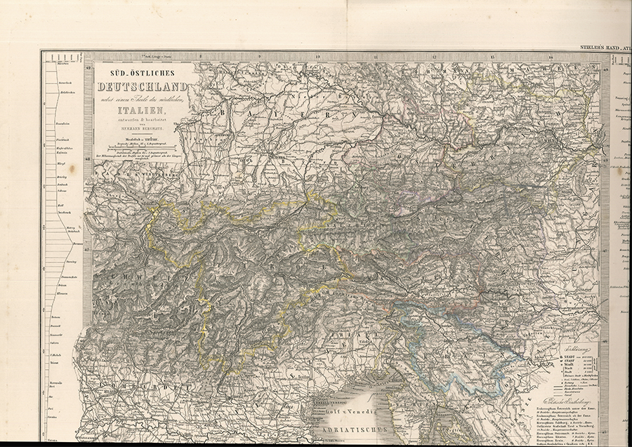 1362-25BERGHAUS, Hermann. Süd-östliches Deutschland nebst einem Theile des nördlichen Italien. Maasstab 1 : 1 850 000. Gotha, Justus Perthes 1873. 37, 5 x 46 cm. gest. Karte. an den Faltkanten kl. Einrisse, geringfügig stockfleckig, Das Gebiet rund um den Semmering ist mit Bleistift-Rechteck markiert. | |