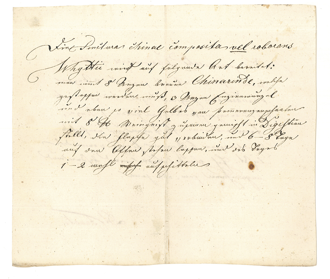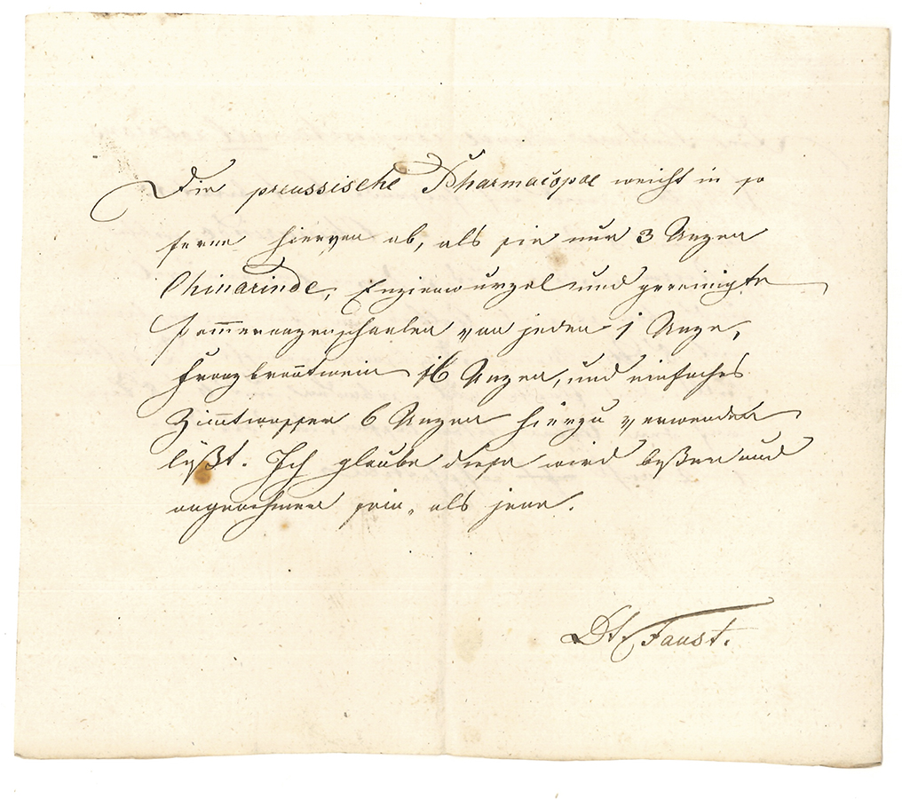 1371-25 CHININ - Eine Tincturae chinae compositas vel [...; Pharmazeutisches Rezept] Handschriftliches Rezept für eine Chinarinden-Tinktur, verso mit einem weiteren Rezept "Ein preussischer Pharamcopae weicht in so fern hiervon ab [....]. Unterzeichnet ist das Blatt mit "Dt. Faust". | |||