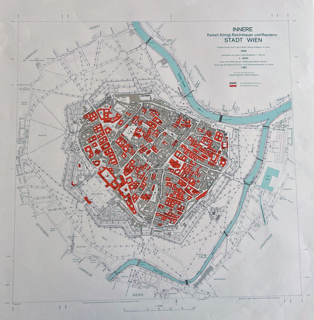1381-25 WIEN - MESSNER, Robert. Innere Kaiserl. Königl. Reichshaupt- und Residenz-Stadt Wien. Aufgenommen durch den Kaiserl. Königl. Kataster am Beginn des Jahres 1846. Verkleinert aus dem Originalmaßstab 1:1440 auf 1:4000 unter Hervorhebung der erhaltengebliebenen Baulichkeiten… Dieser Plan wurde auch dem Werk MESSNER, R. "Wien vor dem Fall der Basteien". Wien, ÖBV 1958 beigegeben. | ||