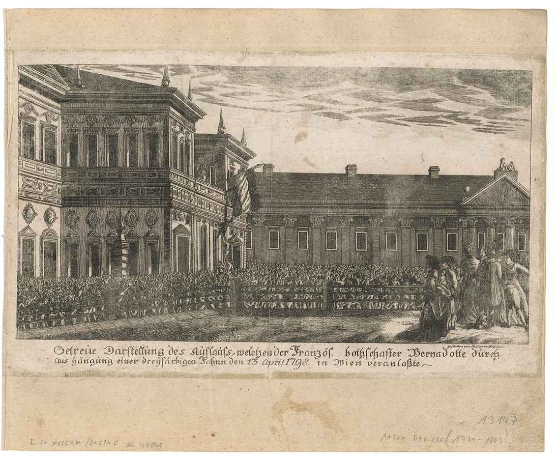 1413-25 BALZER, Anton. Getreue Darstellung des Auflaufs, welchen der Französ. bothschafter Bernadotte durch aus hängung einer dreifärbigen Fahnn den 13. April 1798 in Wien veranlaßte. Seltenes, in Breslau gestochenes Blatt. Der franz. Botschafter, Jean Baptiste Bernadotte, (später König von Schweden und Norwegen) hatte das Geymüllerpalais (heute Wallnerstr. 8 im 1. Bezirk) gemietet. Auf Grund eines Festes hisste er die Fahne der Französischen Republik auf dem Balkon im ersten Stock. Der deshalb ausbrechende Aufruhr führte dazu, das die Fahne abgerissen wurde und ging als "Wiener Fahnentumult" in die Geschichte ein. Ein weiteres Blatt konnte lediglich im Wien-Museum nachgewiesen werden (Inv.-Nr. 49801). | ||