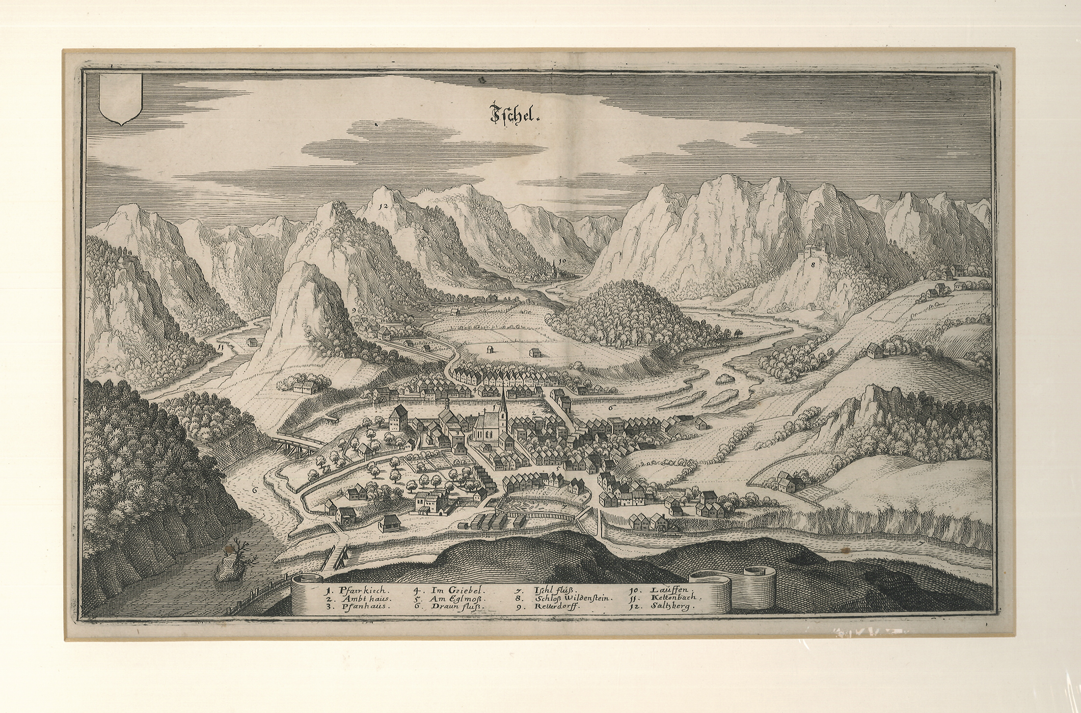 1420-25BAD ISCHL - Ischel. Orig.-Kupferstich aus Merian. Frankfurt am Main, [1649 ff.]. ca. 20,8 x 33 cm. (Bildausschn.). Kräftiger Abdruck. Unter Passep. Minimale mittige Faltspur erkennbar. Kl. Braunfleck in der Darstellung. Nebehay-W. 407, 10 - Kupferstich aus Matth. Merians "Topographia Provinciarum Austriacarum". | |