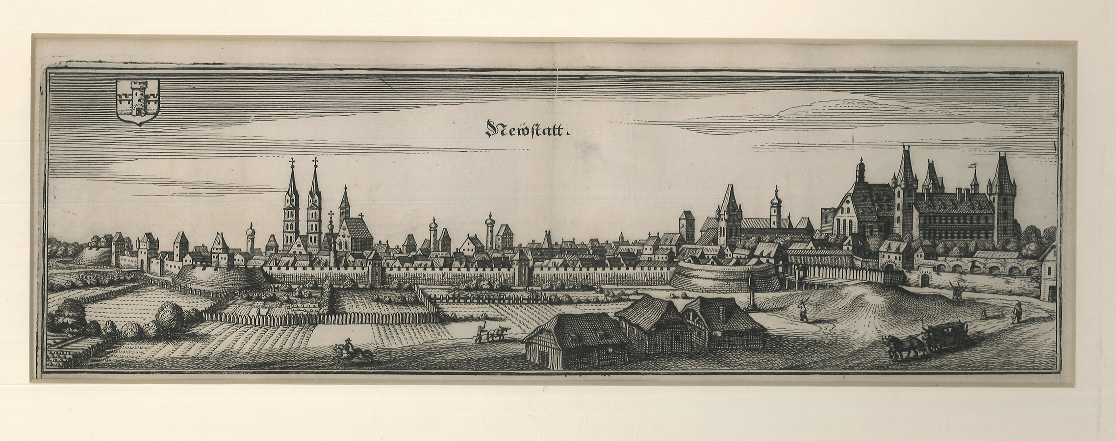 1424-25WIENER NEUSTADT - Newstatt. Orig.-Kupferstich aus Merian. Frankfurt am Main, [1649 ff.]. ca. 10,3 x 31 cm. (Bildausschn.). Kräftiger Abdruck. Unter Passep. Minimale mittige Faltspur erkennbar. Nebehay-W. 407, 23 - Kupferstich aus Matth. Merians "Topographia Provinciarum Austriacarum". | |