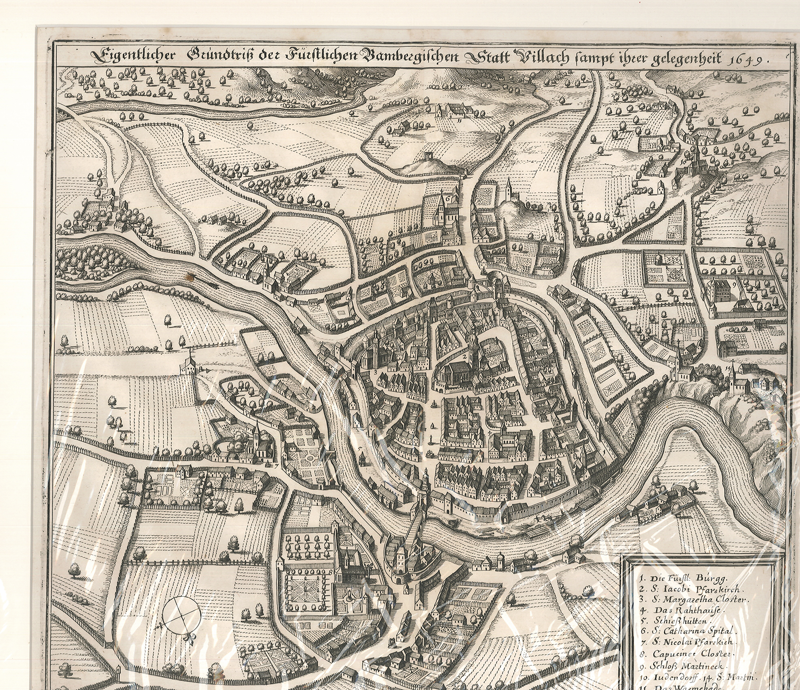 1425-25 VILLACH - Eigentlicher Grundtriß der Fürstlich Bambergischen Statt Villach sampt ihrer gelegenheit 1649. Nebehay-W. 407, 64 - Ansicht von Villach aus der Vogelperspektive. Kupferstich aus Matth. Merians "Topographia Provinciarum Austriacarum Austriae Styriae, Carinthiae [...]". Erste Ausgabe v. 1649. | ||