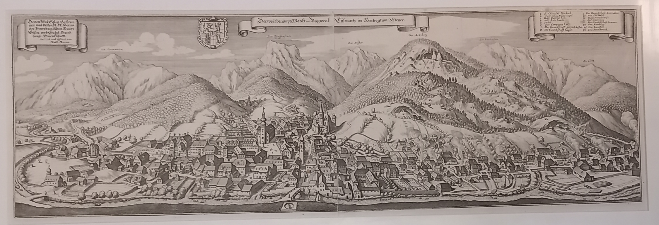 Der weyt berümpte Marckt und Bergwerck Eysenartz im Hertzogtum Steyer. Orig.-Kupferstich von 2 Platten aus Merian. Frankfurt am Main [1649 ff.]. ca. 23,5 x 71 cm. (Bildausschn.). Kräftiger Abdruck. Unter Passep. Minimale mittige Faltspur erkennbar.